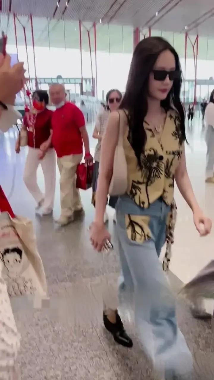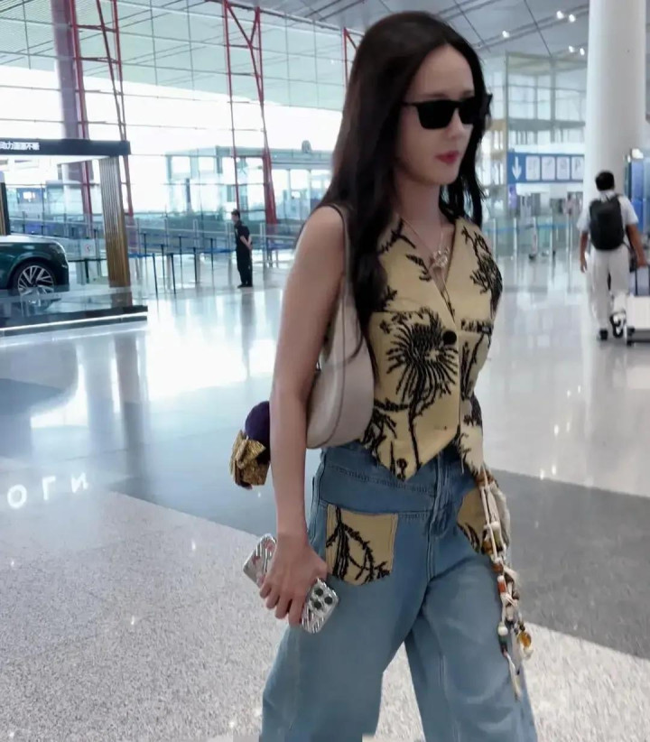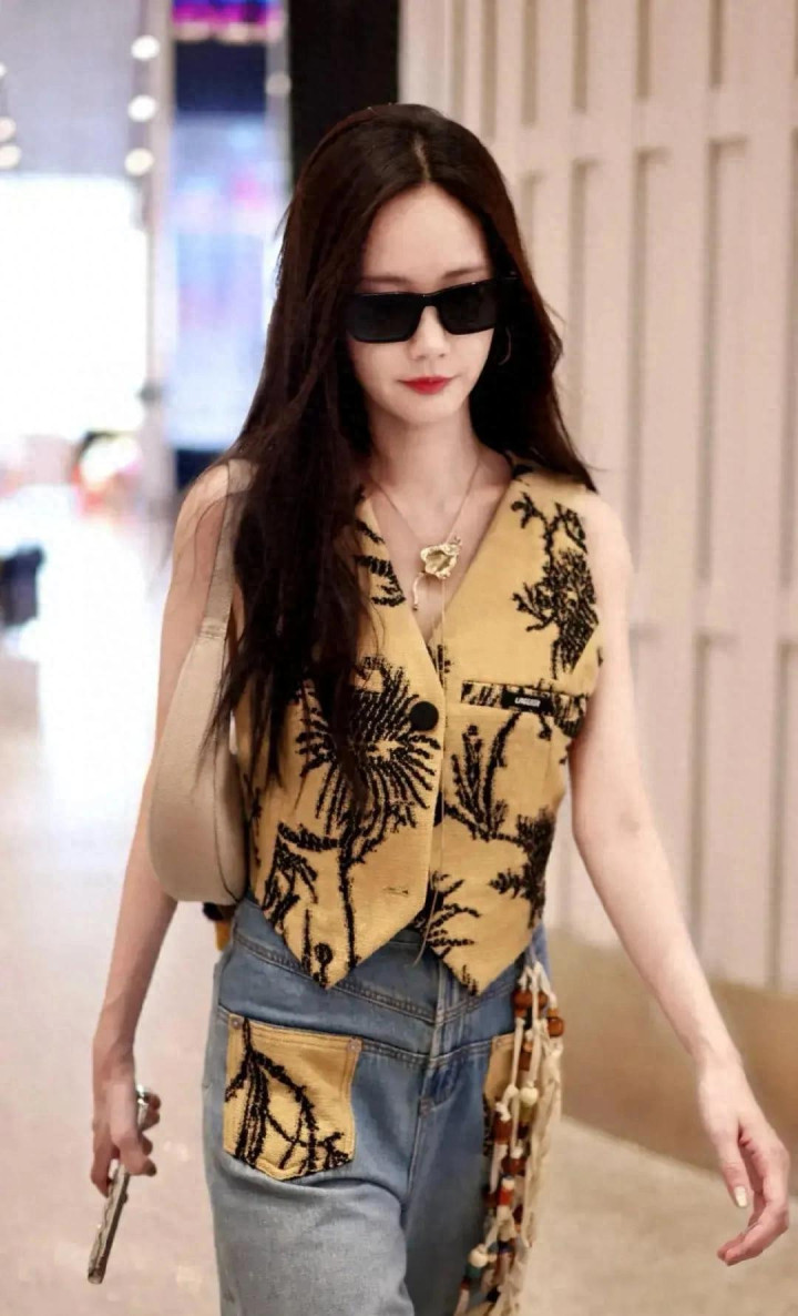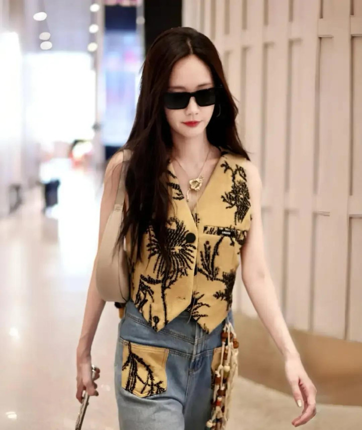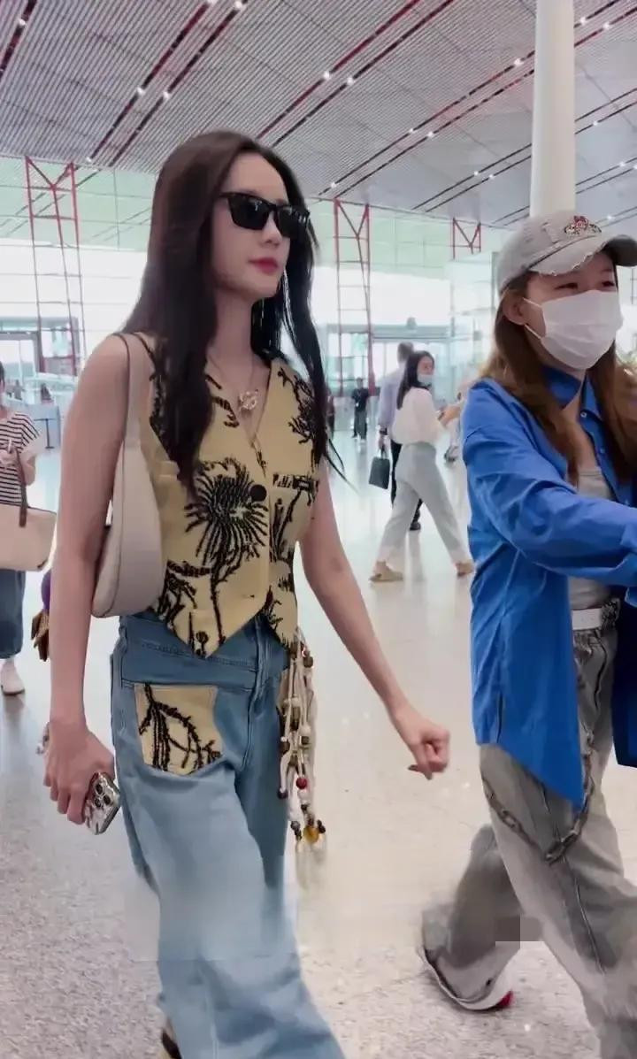 专业配资炒股网李一桐北京机场出发, 卡其刺绣马甲配牛仔, 又美又飒