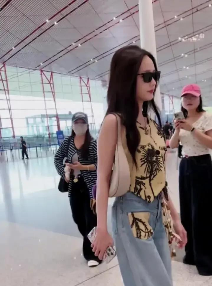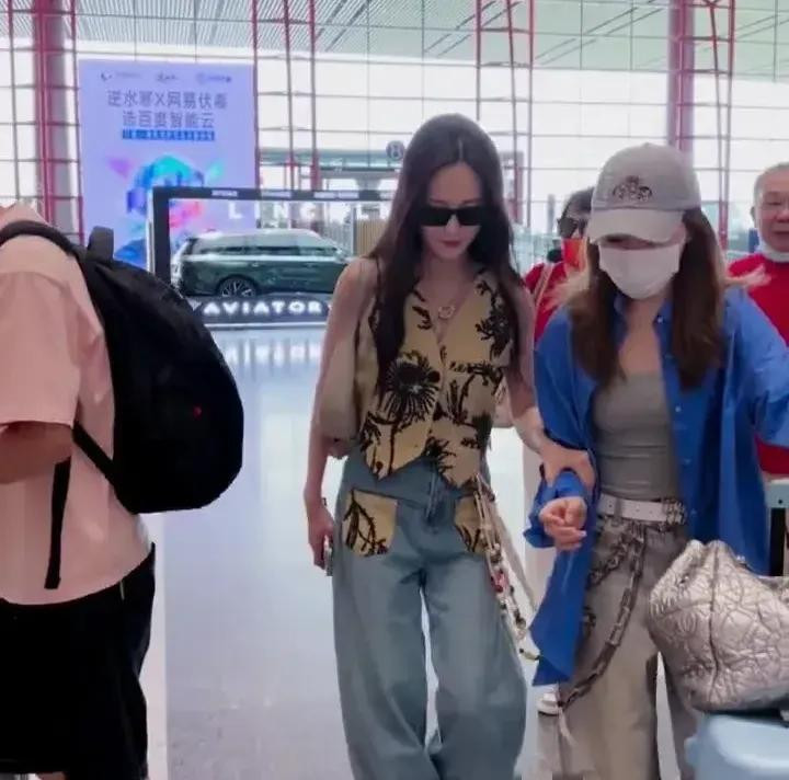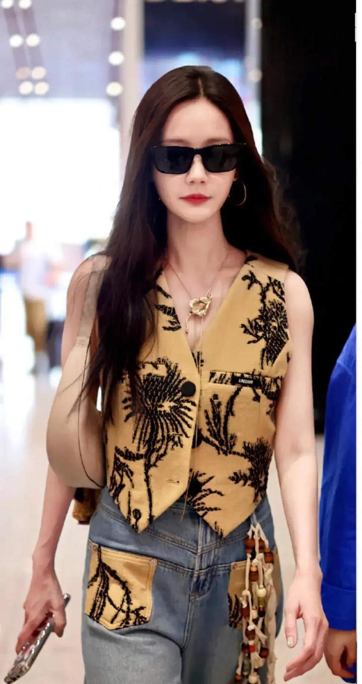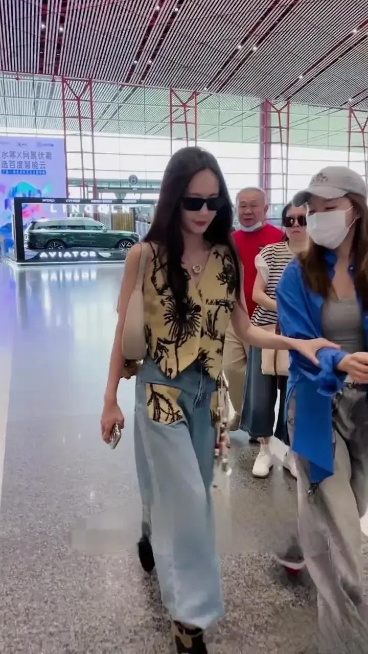专业配资炒股网李一桐北京机场出发, 卡其刺绣马甲配牛仔, 又美又飒